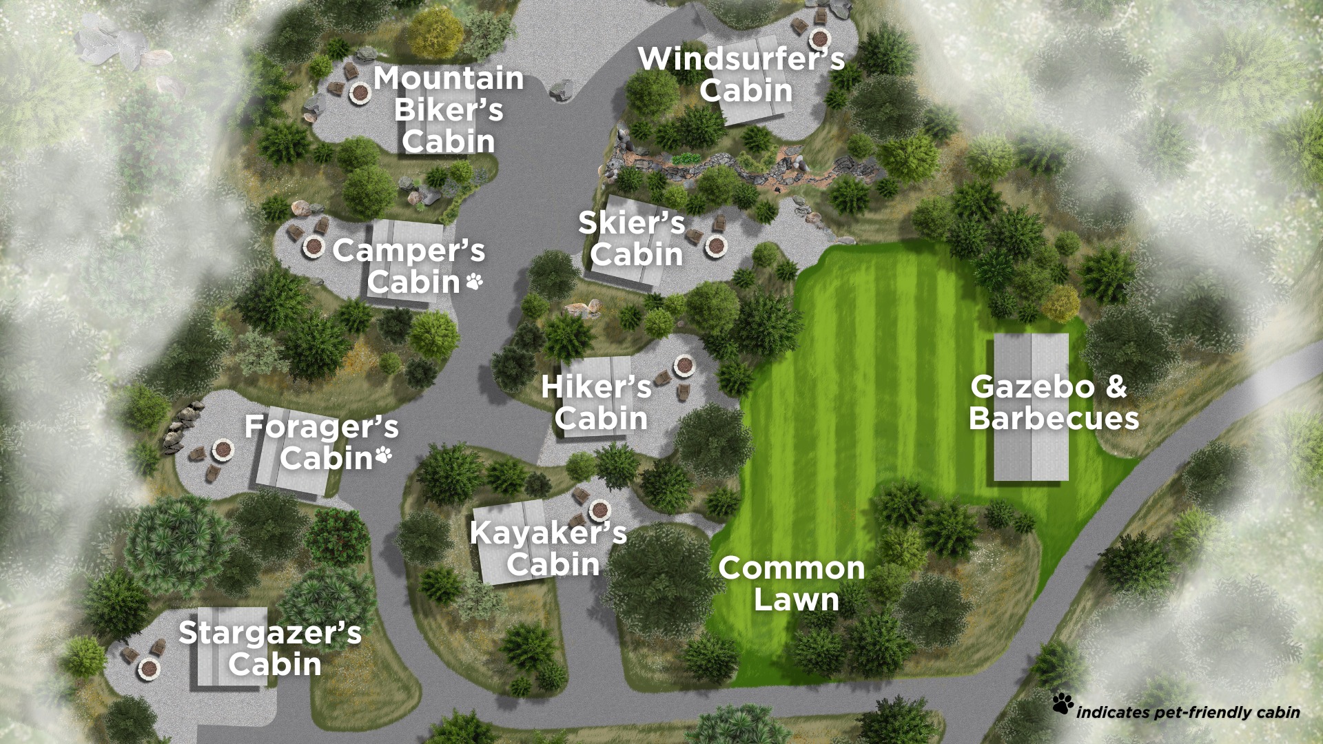 Groups and/or families are encouraged to gather in the communal grassy area featuring picnic tables and corn hole. In addition, fire pits, flanked by Adirondack chairs, can be found at each cabin's tranquil seating areas.